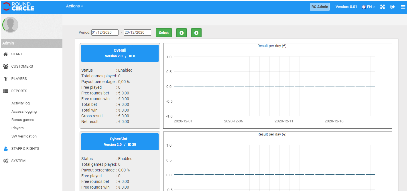 The Round Circle Online Platform manages online games and facilitates the integration of games into platforms used by operators. Operators who have Round Circle or Bet Industries games, have access to this platform.